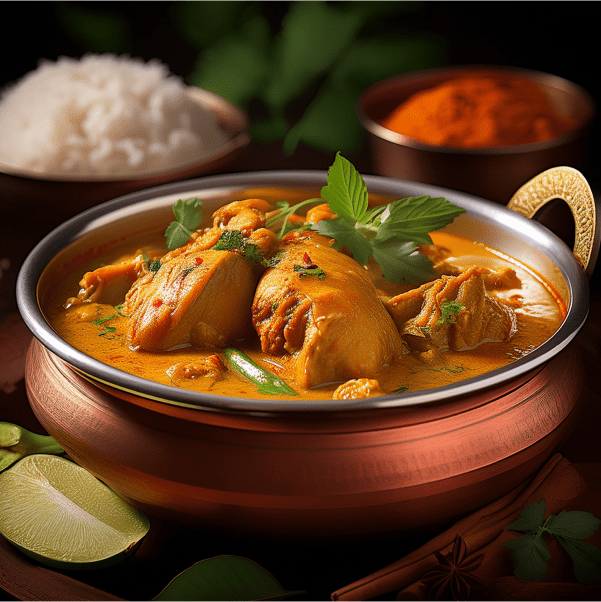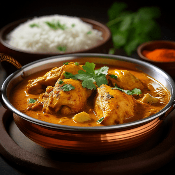 Chicken Curry is made by slow-cooking tender chicken pieces with a base of caramelized onions, ripe tomatoes, and a fragrant spice blend including turmeric, cumin, coriander, and red chili powder. Fresh ginger, garlic, and a touch of garam masala add depth, while a splash of yogurt or coconut milk (optional) brings a subtle creaminess to the dish. The curry is simmered until the flavors meld into a thick, savory gravy that coats the chicken perfectly.